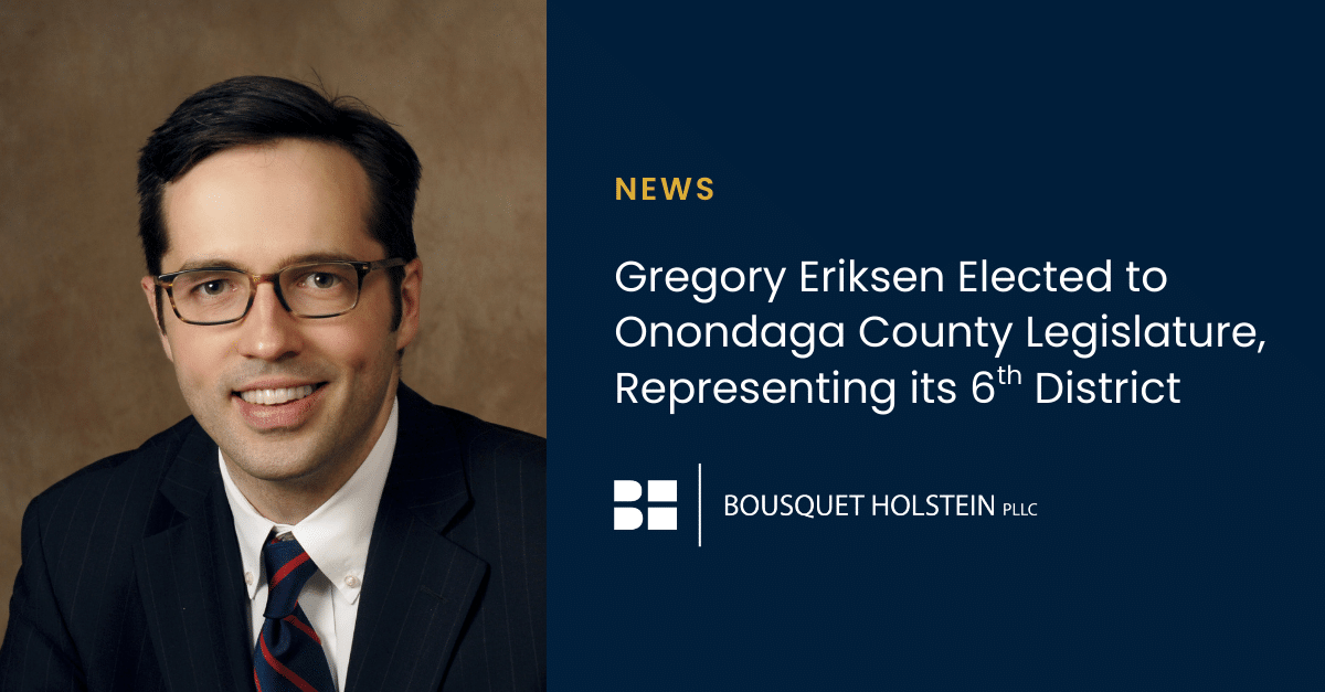 Bousquet Holstein attorney Gregory Eriksen was elected this past month to the Onondaga County Legislature. He will represent the County's 6th District which includes Marcellus, Skaneateles, Spafford, and parts of Camillus.